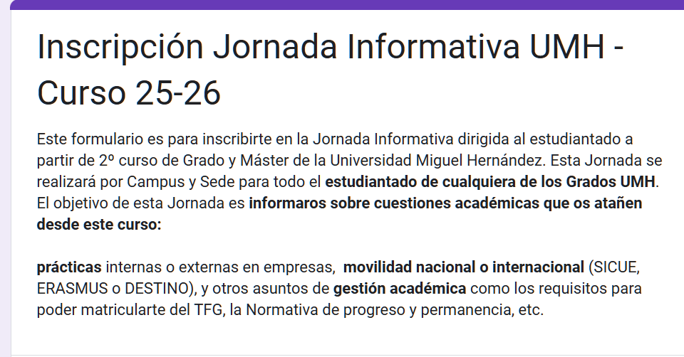 La UMH te invita a una Jornada Informativa para el estudiantado a partir de 2º curso de los Grados y másteres UMH. El objetivo es informarte sobre cuestiones académicas que te atañen desde este curso, por ejemplo: prácticas internas o externas en empresas, movilidad nacional o internacional (SICUE, ERASMUS o DESTINO), y otros asuntos de gestión académica como los requisitos para poder matricularte del TFG, la Normativa de progreso y permanencia, etc.