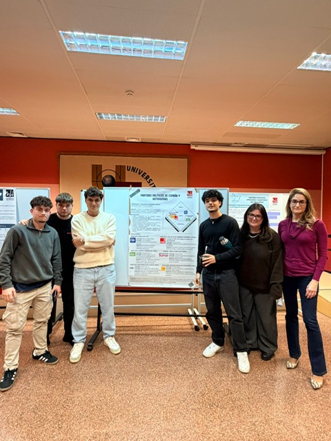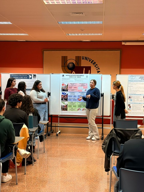 La actividad, abierta a la comunidad universitaria, consistió en la exposición de cinco pósteres científicos en los que el alumnado presentó los principales resultados de sus investigaciones sobre ideologías políticas en distintos contextos geográficos. A través de este formato, el estudiantado pudo acercarse de manera práctica al mundo de la investigación politológica, trabajando con fuentes académicas, datos comparados y metodologías propias de la disciplina.